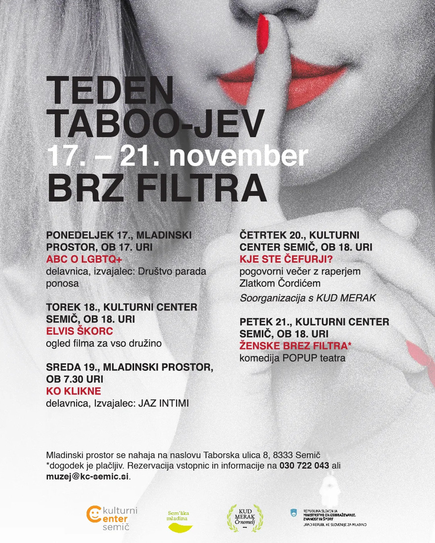 Vabimo vas, da se nam pridružite na Tednu taboo-jev, ko bomo pogumno odpirali teme, o katerih se redko govori. Skupaj bomo razbijali predsodke, se učili poslušati, razumeti in spoštovati različnost.