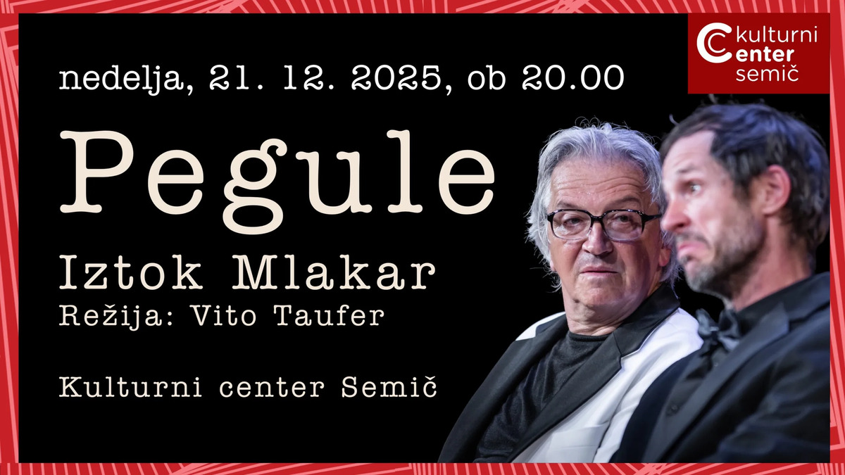 Vabljeni na gledališko predstavo Iztoka Mlakarja PEGULE v nedeljo, 21. decembra 2025, ob 20. uri v Kulturni center Semič.
