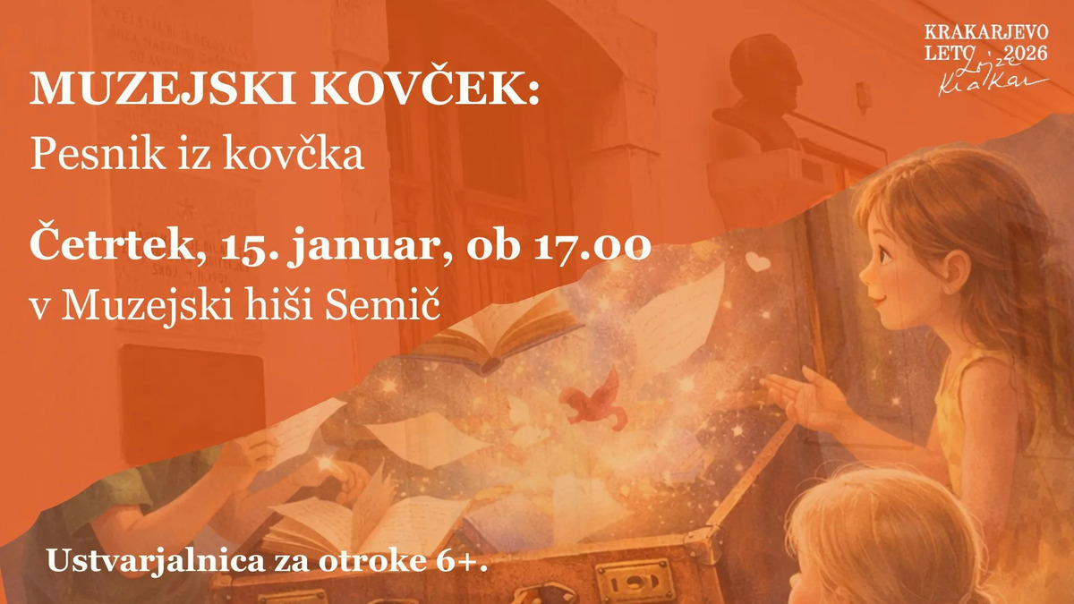 Kulturni center Semič vas vabi na delavnico MUZEJSKI KOVČEK: PESNIK IZ KOVČKA v četrtek, 15. januarja 2026, ob 17.00 v Muzejski hiši Semič.