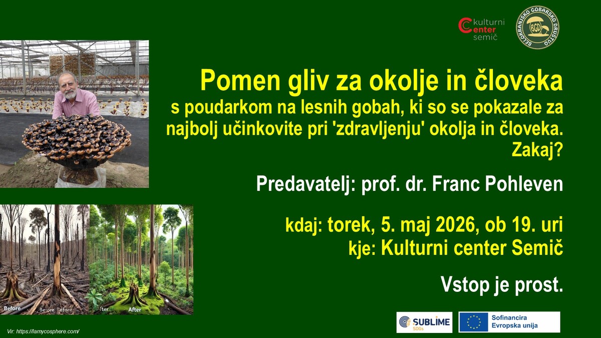 Belokranjsko gobarsko društvo vabi na zanimivo in aktualno predavanje Pomen gliv za okolje in človeka, ki bo v torek, 5. maja 2026, ob 19. uri v Kulturnem centru Semič, Prosvetna ulica 4, 8333 Semič.