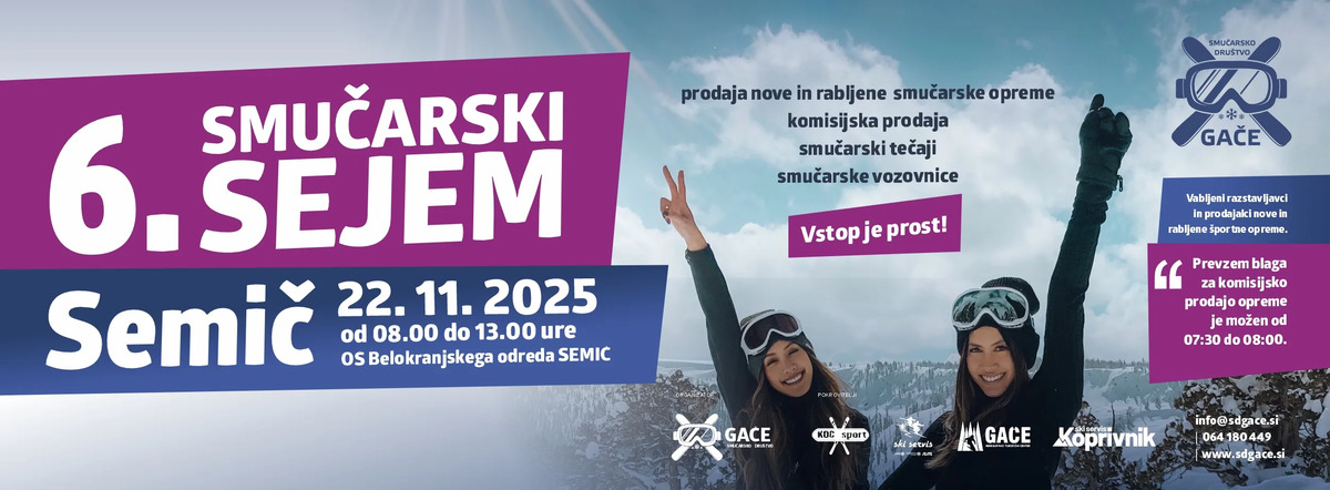 Smučarsko društvo Gače vas vabi na 6. SMUČARSKI SEJEM SEMIČ 2025 v soboto, 22. novembra 2025, od 8. do 13. ure v prostorih OŠ Belokranjskega odreda Semič.