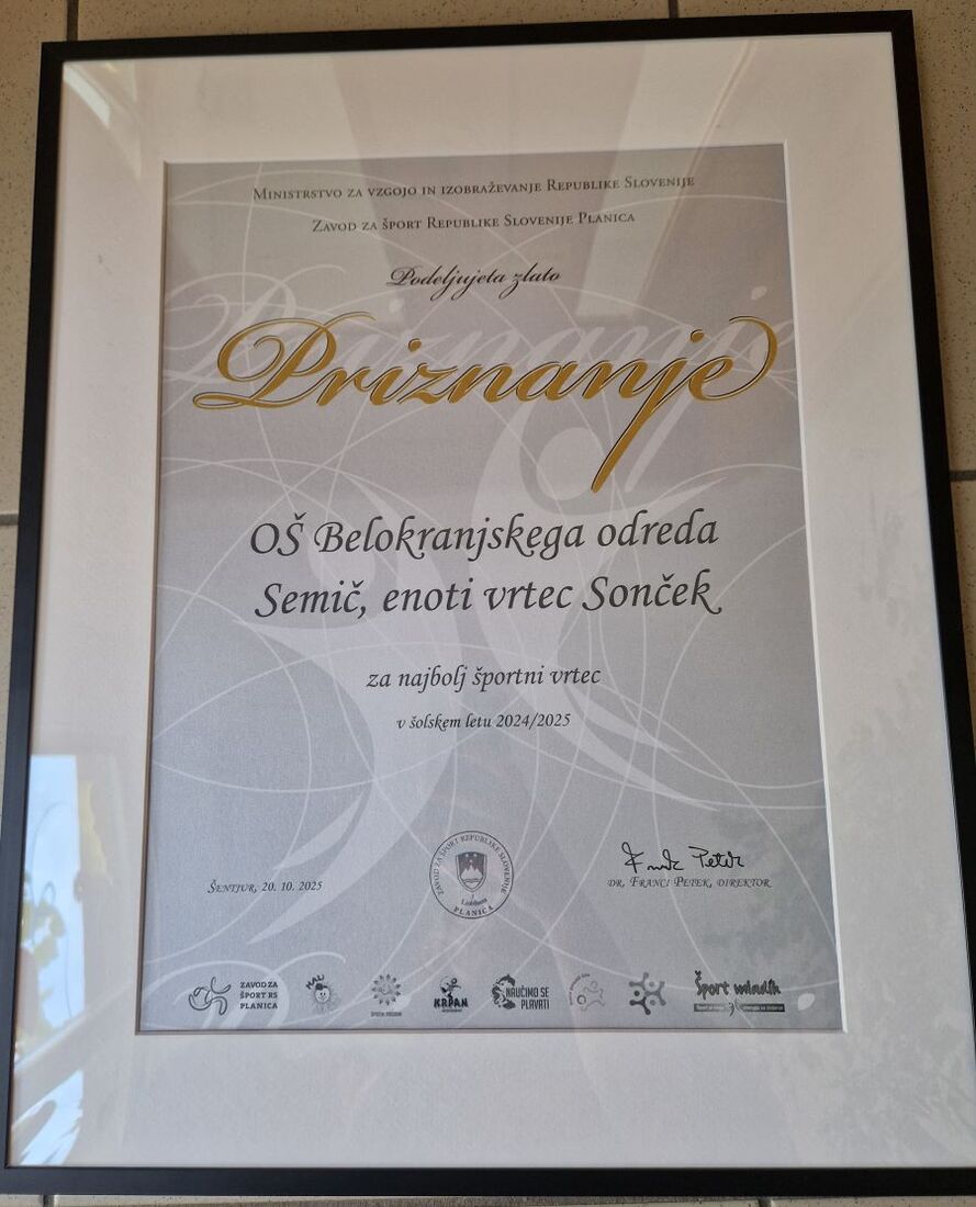 Svečana podelitev priznanj je potekala v ponedeljek, 20. oktobra 2025, na Osnovni šoli Hruševec v Šentjurju pri Celju. Priznanje Vrtcu Sonček je podelil direktor Zavoda Planica, nekdanji vrhunski smučarski skakalec, dr. Franci Petek.