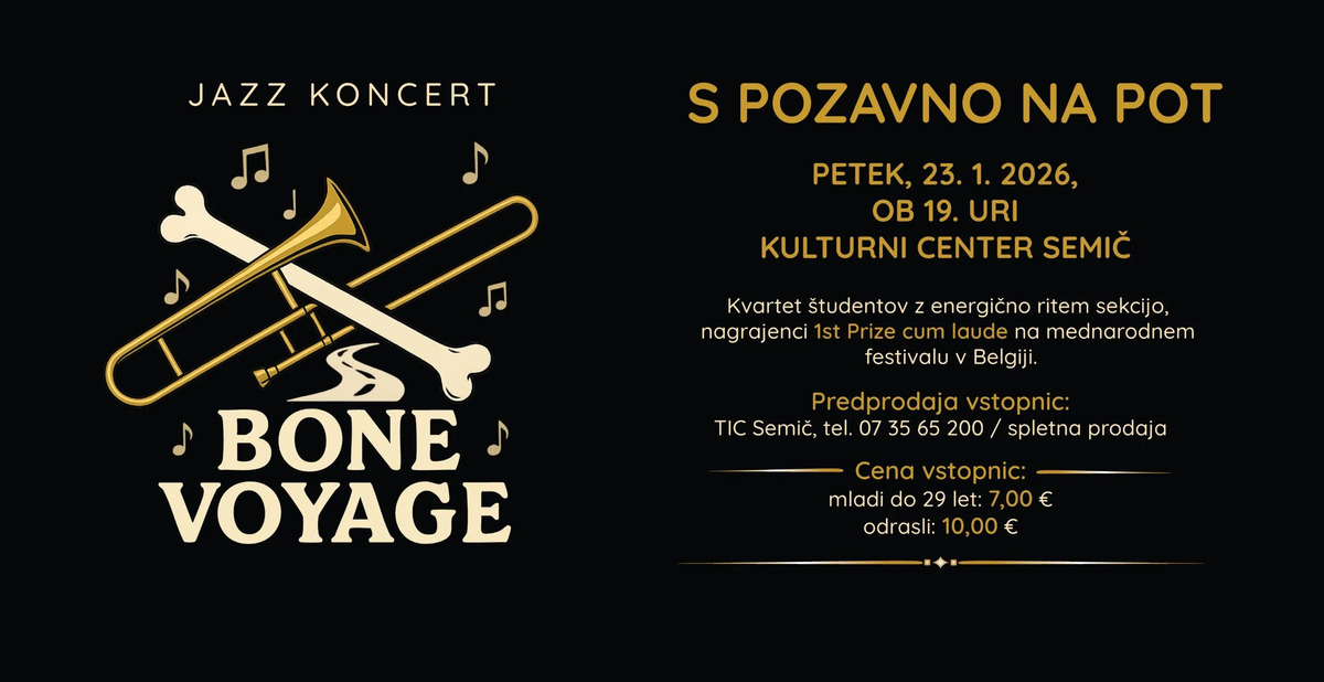 Vljudno vabljeni na jazz koncert S POZAVNO NA POT v izvedbi skupine Bone Voyage, ki jo sestavljajo študenti jazz glasbe, v petek, 23. januarja 2026, ob 19. uri v Kulturnem centru Semič.