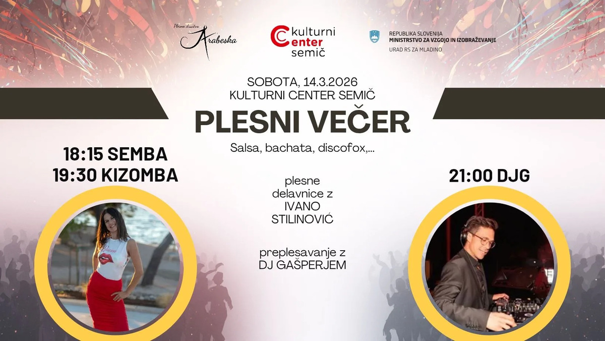 Plesno društvo Arabeska in Kulturni center Semič vas vabita na PLESNI VEČER v soboto, 14. marca 2023, od 21. do 23. ure v Kulturni center Semič.
