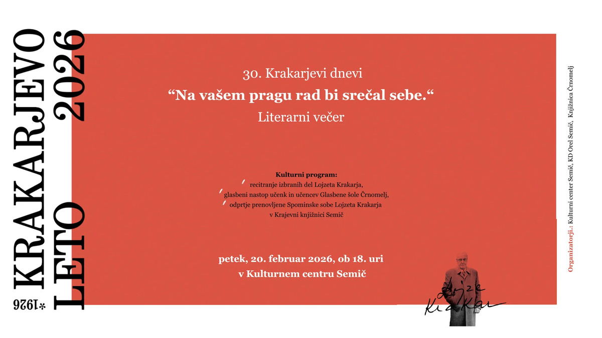 Kulturni center Semič, KD Orel Semič in Knjižnica Črnomelj v sklopu Krakarjevega leta 2026 vabijo na literarni večer z naslovom »Na vašem pragu rad bi srečal sebe.« v petek, 20. februarja 2026, ob 18.00 v Kulturnem centru Semič. Literarni večer je organiziran v sklopu jubilejnih 30. Krakarjevih dnevov, ki bodo leto potekali od 20. do 22. februarja.