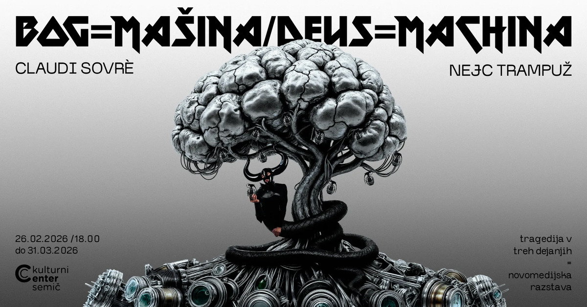 Kulturni center Semič vas vabi na novomedijsko razstavo Nejca Trampuža in Claudie Sovreta z naslovom BOG=MAŠINA / DEUS=MACHINA v četrtek, 26. februarja 2026, ob 18.00 v Kulturnem centu Semič.