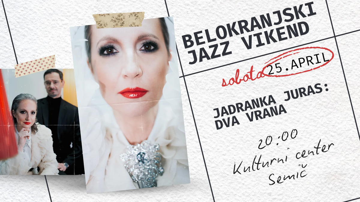 Kulturni center Semič vas v sklopu Svetovnega dne jazza vabi Belokranjski jazz vikend – koncert JADRANKE JURAS “DVA ČRNA VRANA” v soboto, 25. aprila 2026, ob 20.00 v Kulturnem centru Semič.